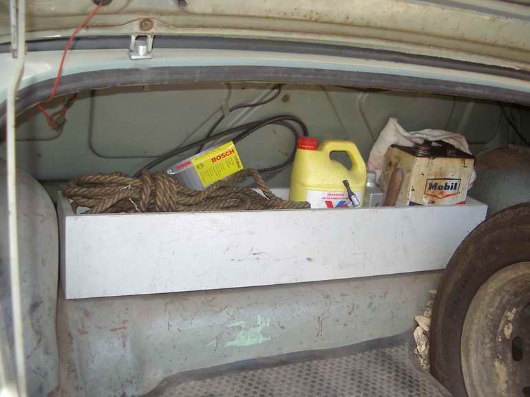 Board thickness: 1/2 inch, except the base which is 5/8 inch. Mounting: 2 steel bolts (countersunk head in the box) with nuts under the car body. Doesn't rattle. Outside dimensions: Length 36" Width (front to back) 6½" Height 6". The front of the box is at least ¾" clear of the body (behind the rear seat backrest) to prevent minor rattling, and giving space to store a couple of spare fan belts. |