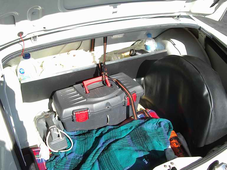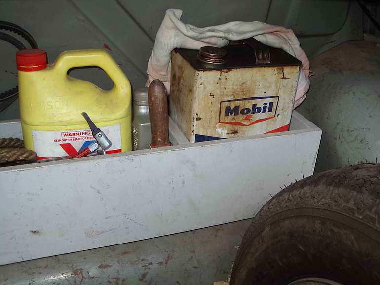 The interior partition is to hold the petrol can in place. I pad the can with rags on all sides to prevent chafing & rattling. A fire safety fanatic might insist that the can be strapped in, so that it won't dislodge in a rollover, but it's very safe in any other situation. I normally store engine oil & coolant to the right of the spare wheel, leaving plenty of room in the box for spanners, screwdrivers, spare globes etc.