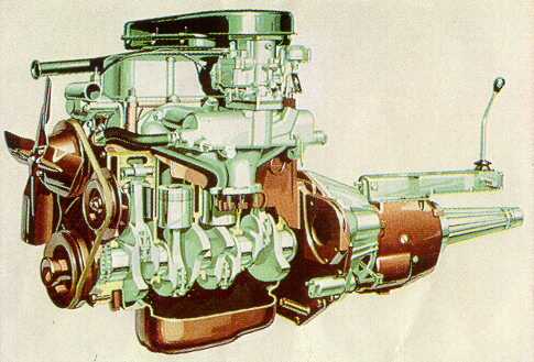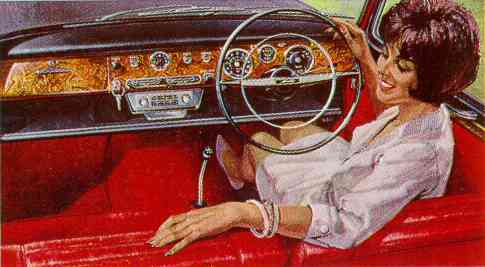 OF THE FLASHING NEW HILLMAN GAZELLE DE-LUXE SALOON Engine. Four-cylinder five-bearing crankshaft unit with aluminium cylinder head and push rod operated overhead valves. Solex compound carburettor. Bore 3.21in. (81.5mm). Stroke 3.25in (82.55mm). Capacity 105.2cu.in. (1,725cc). Engine develops 85 maximum bhp at 5,500rpm and maximum torque 105.9lb.ft. at 3,500rpm. Compression ratio 9.2:1. Ignition. Coil and distrubutor; centrifugal advance and retard mechanism, vacuum control; Champion N5 sparking plugs. Cooling system. Centrifugal pump and fan, thermostatic control. Coolant pressure fed to cylinder head with selective cooling of valve seats, stems and sparking plug bosses. Clutch. 7½in. Borg and Beck diaphragm spring. Hydraulically operated by pendant pedal. Gearbox. Four forward speeds and one reverse with control ring synchromesh on all forward gears. Centre-floor gear change is fitted. Rear axle. Hypoid semi-floating axle shafts to the rear wheels. Ratio: 3.89:1. Overall ratios:  Top 3.89:1; Third 5.413:1; Second 8.324:1; First 13.04:1; Reverse 13.88:1. Chassis. Unitary construction of chassis and body provides exceptional strength and rigidity. Front suspension. Fully independent front wheel suspension by means of swinging links and coil springs controlled by double-acting hydraulic telescopic shock absorbers and a torsion bar sway eliminator fitted between the lower links. All greasing points eliminated. Rear suspension. Semi-elliptic leaf springs with dual rate characteristics to suit load conditions. Double acting hydraulic telescopic shock absorbers maintain adequate control. Wheels. Five pressed steel wheels with wide base rims. Four wheels are embellished with polished nave plates and wheel trim discs. Spare wheel held vertical in well in right-hand side of luggage compartment. Tyres. Tubeless 6.00x13in. Brakes. Lockheed hydraulic, 10.3in. disc brakes at front with 9in. brake drums at rear. The handbrake operates through a system of cables and the linkage is independent of the footbrake. Steering. Burman recirculating ball type. Three-piece symmetrical track rod linkage. No greasing points. Dished steering-wheel with chromium-plated horn ring. Petrol tank. 10 gallons capacity positioned beneath luggage compartment floor. Standard equipment. Over-riders, heating and ventilation system, wheel trims, windscreen washers. Weights (approx.) Unladen (with petrol and water) 2,250lb. Dry (without petrol and water) 2,159lb. Main dimensions. Overall length 164½in. Overall width 60¾in. Overall height 58in. Borg-Warner fully-automatic transmission (optional extra). No system is simpler to handle or more completely automatic. Ask your Dealer for details. Special accessories (available at extra cost). A very full and attractive range of accessories is available. Full details can be obtained from your Dealer. Colour schemes on application