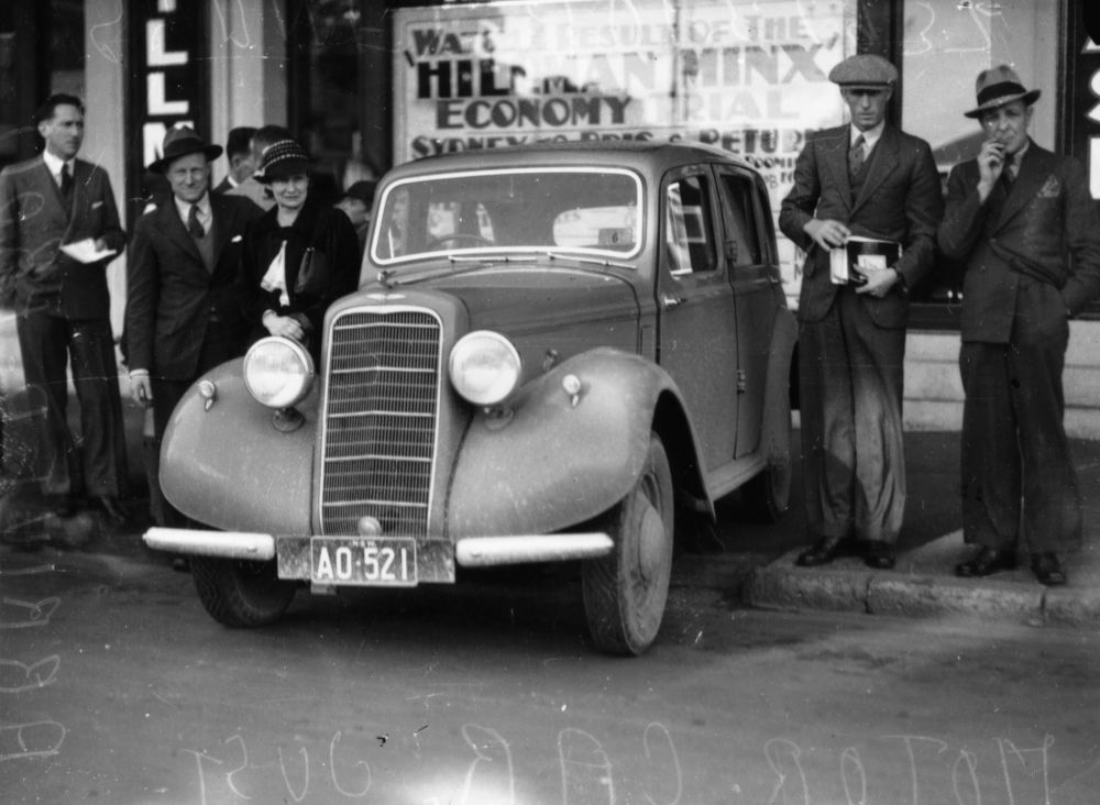 Title: Hillman Minx Saloon arriving from Sydney on an Economy Trial, July 1937.