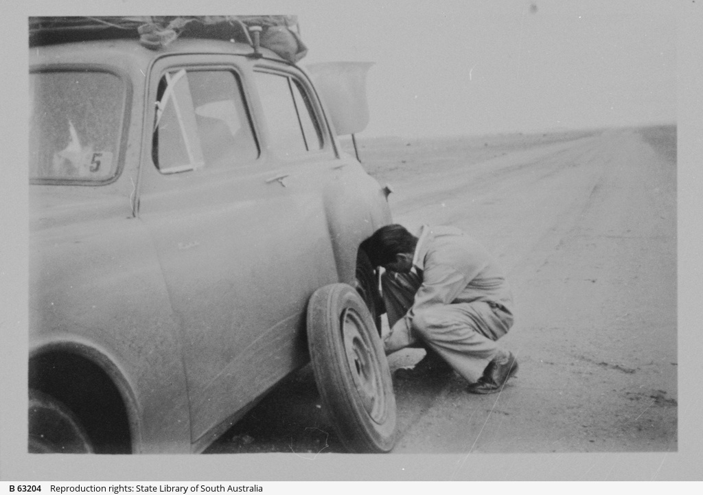 Summary: Trevor Colwell changing a tyre on the back wheel of his Hillman motor car during a trip in South Australia.