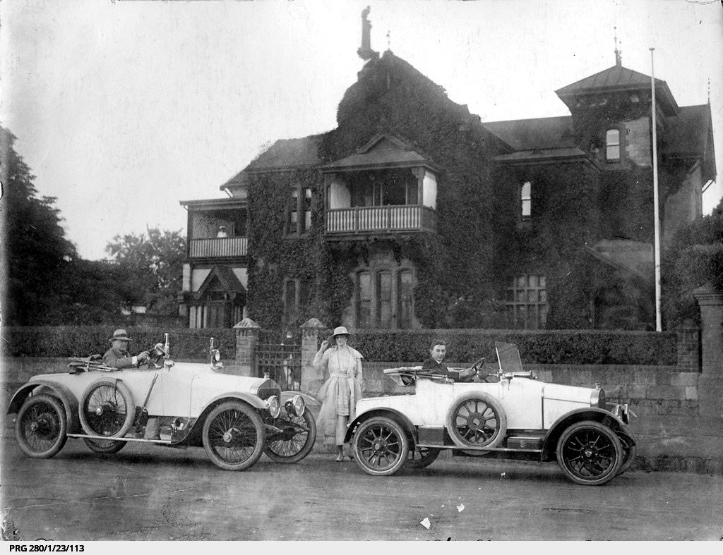 Summary: Evan Kyffin Thomas at the wheel of his Straker Squire motor car, his son Rendel in a Hillman car, and Mrs. Kyffin Thomas (Maisie) standing outside their house at 55 Pennington Terrace, North Adelaide.