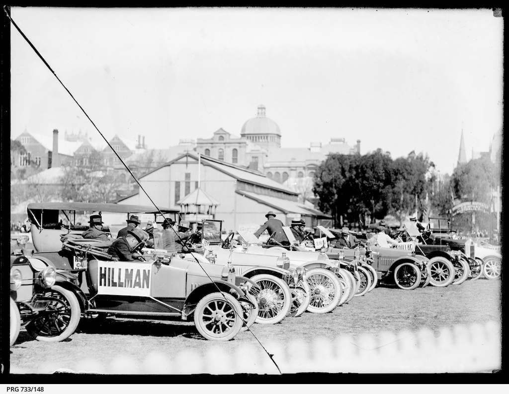 Summary: A line of early motor vehicles at the rear of the Jubilee Exhibition building (i.e. Victoria Drive, Adelaide).