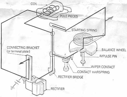 When the starting spring is brought into contact with the rectifier bridge it completes the circuit and energises the pole pieces causing the balance to deflect.